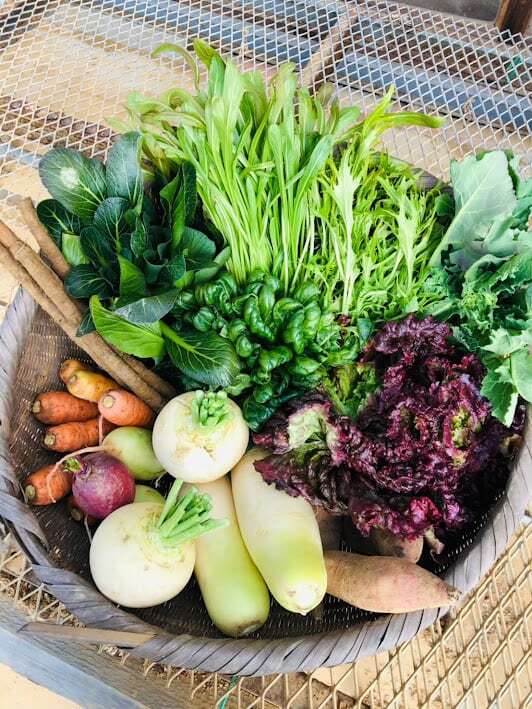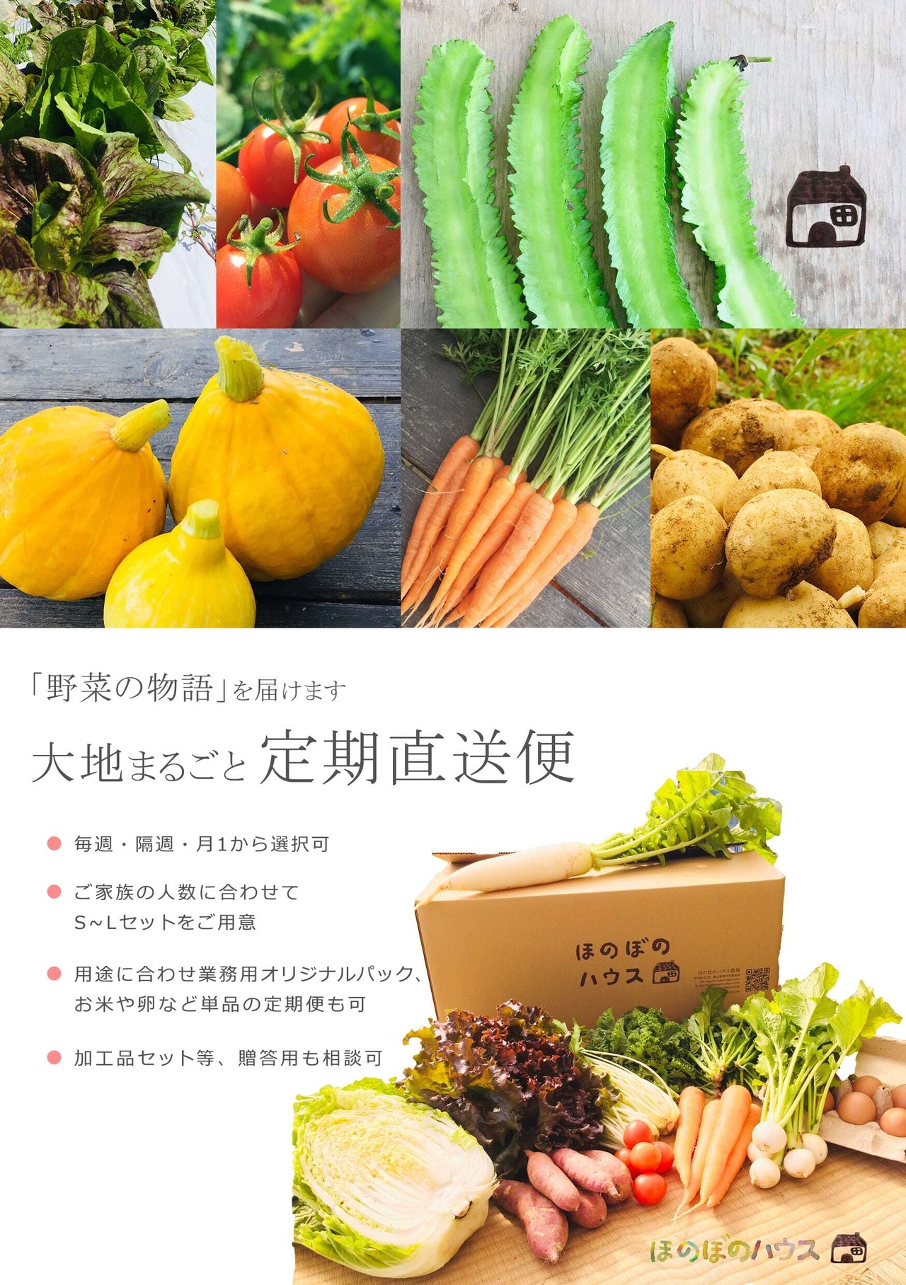 菜花、小松菜、カブ、キャベツ、ニンジン、大根、ブロッコリー、スナップエンドウ、ズッキーニ、サニーレタス、インゲン、サツマイモ、ニンニク、玉ねぎ